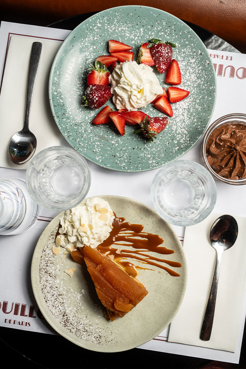 Les serveurs en tablier noir, les banquettes en cuir, le sièges en velour rouges, les miroirs, le bruit des assiettes, et parfois un fond musical tout droit sorti d’un vieux Paris : c’est une expérience vivante, chaleureuse et sans prétention.